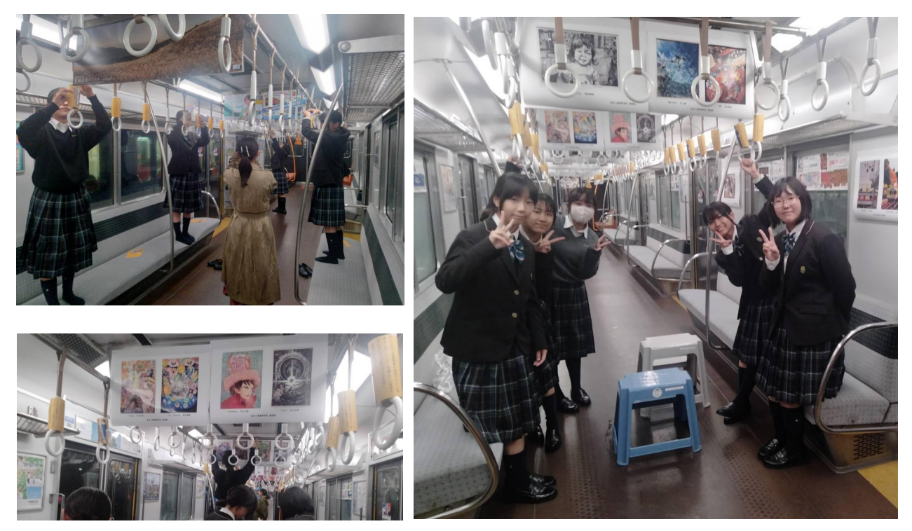 前日の10月31日(金)の放課後に準備を行いました。中学生部員が大活躍で、つり革に美術部ブースの宣伝を巻き付けたり、吊り広告の場所に本校美術部の作品がプリントされたポスターを貼ってくれたりと、一生懸命車両内の装飾を準備してくれました。