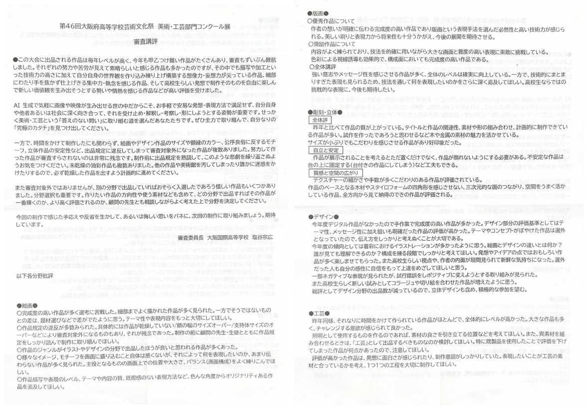 第46回大阪府高等学校芸術文化祭美術工芸部門コンクール展が2026年1月14日(火)~1月18日(日)の日程で大阪市立美術館で開催されました。大阪市立美術館での開催は数年ぶりです。本校は21点出品し、奨励賞2点受賞、入選8点でした!