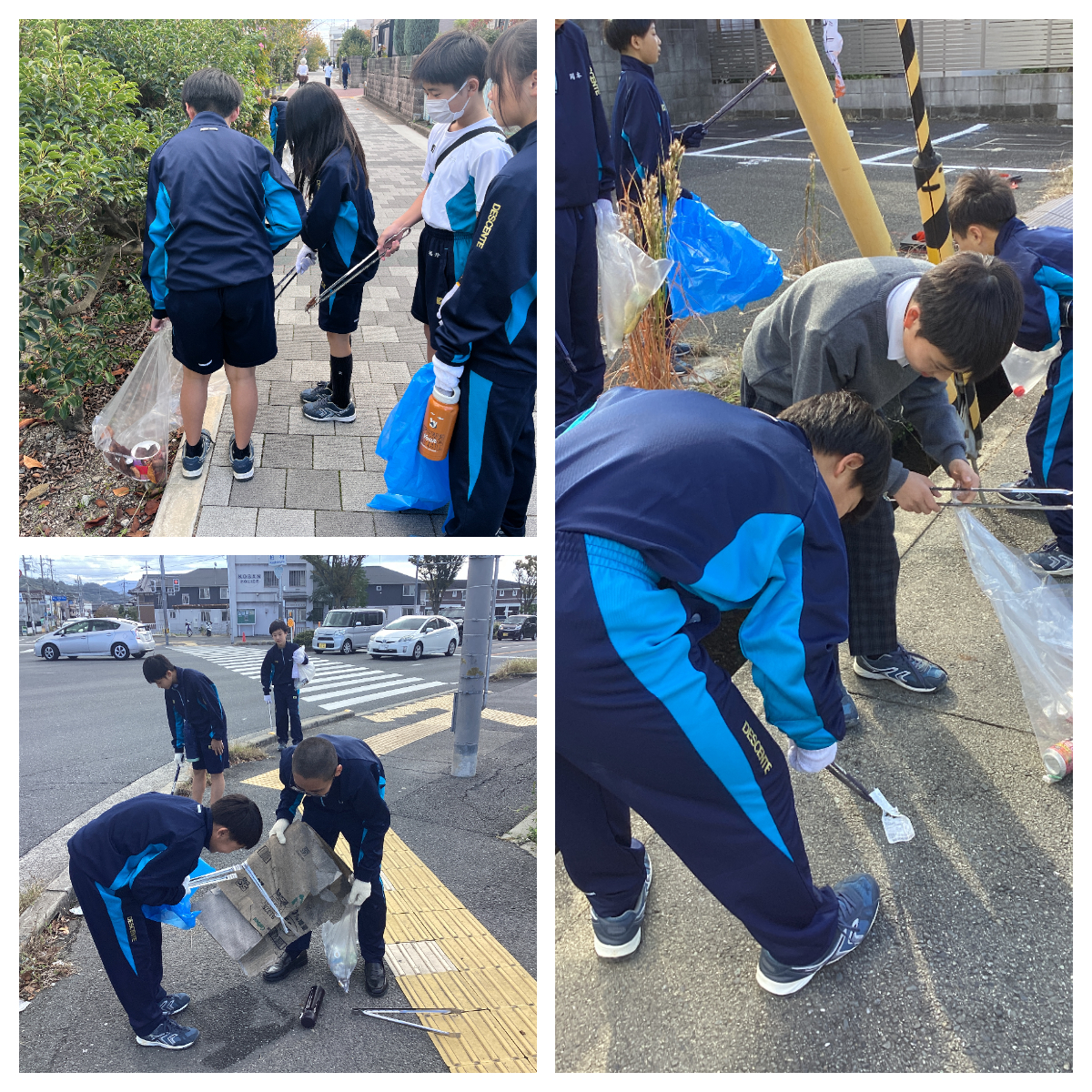 本日、中学1年生は道徳の時間を利用して、学校周辺の清掃活動を実施しました。普段利用している通学路をきれいにすることで、地域の皆様への感謝の気持ちを伝えることができました。通行する方々から、「ありがとう」という言葉を聞いて、生徒たちはやりがいを感じている様子でした。