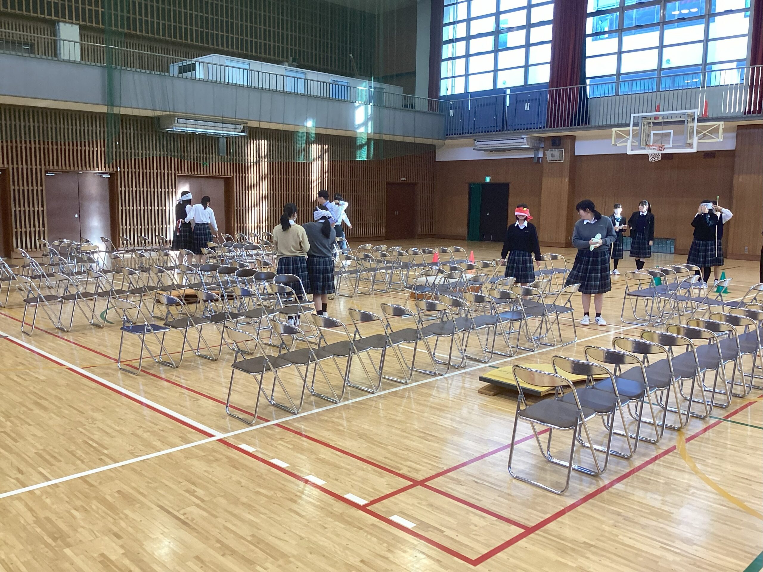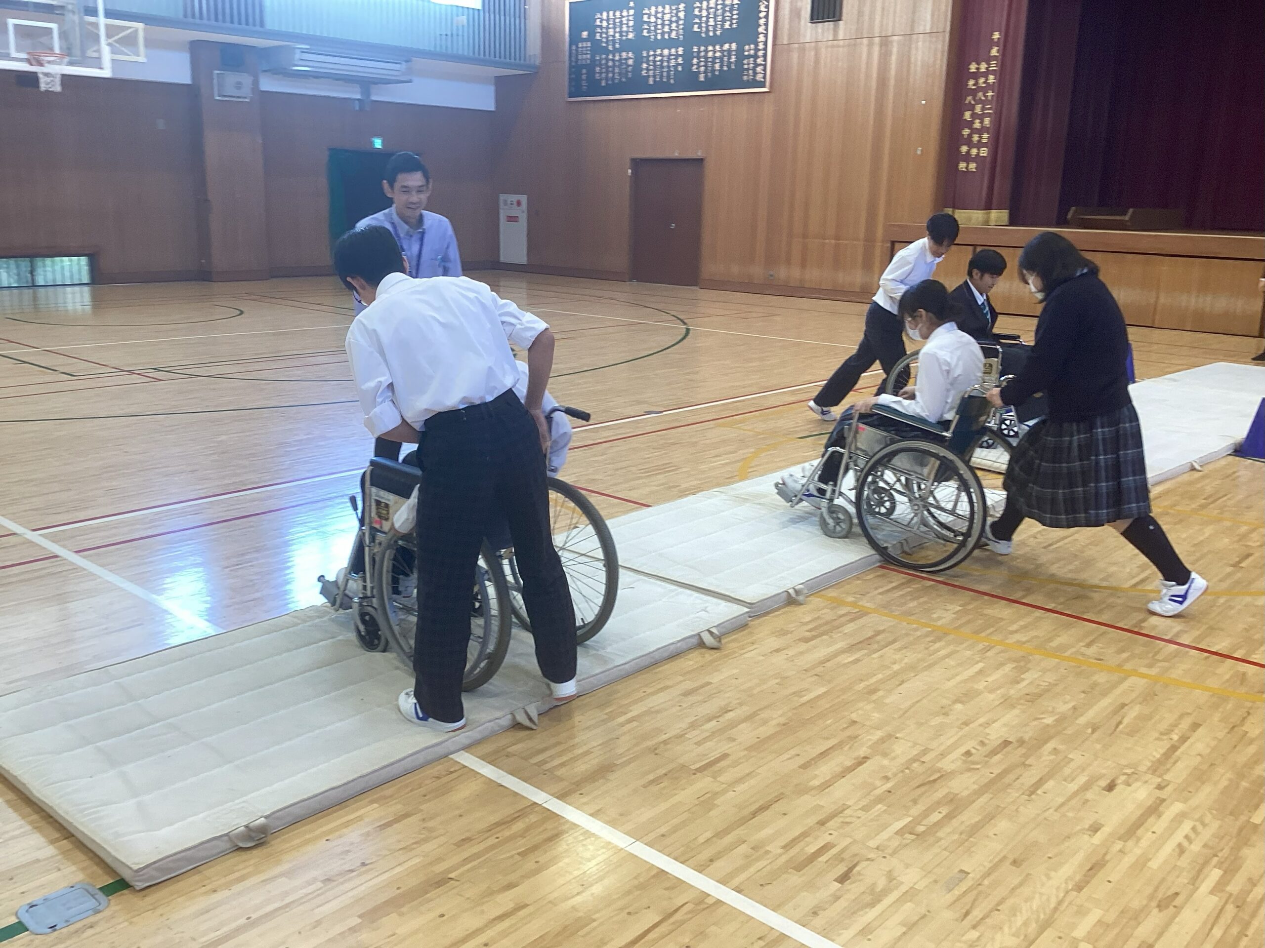 10月29日(火)7限目の人権教育LHRで、高校1年生が車いすとアイマスクを使って障がい者の歩行を体験しました。