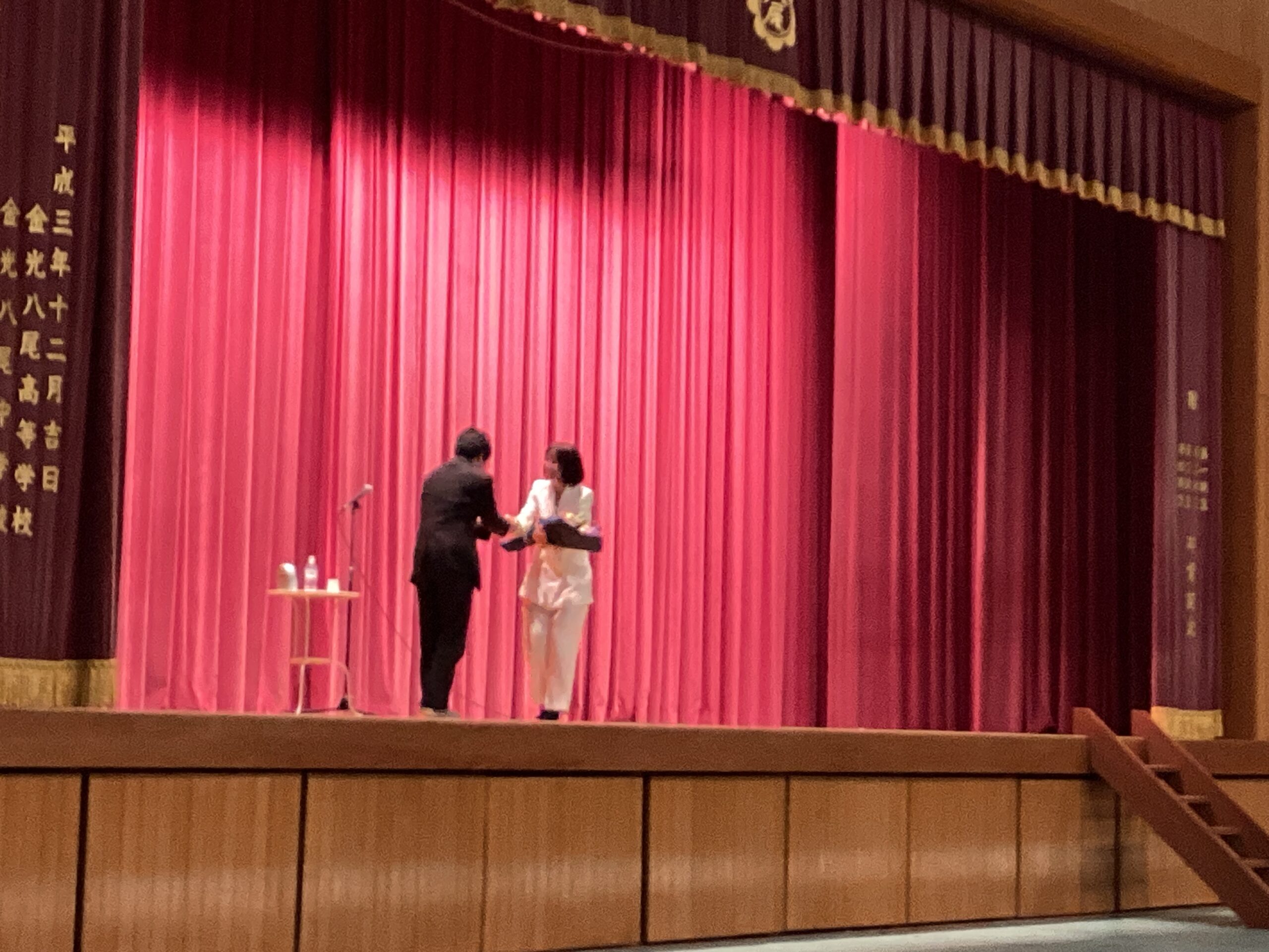 講演会終了後に、代表生徒から花束の贈呈をさせていただきました。ありがとうございました。