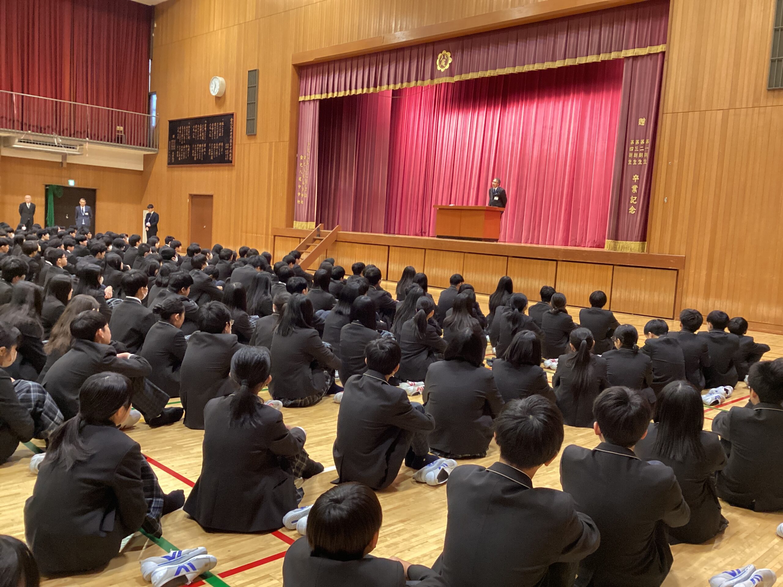 本日、第2学期の終業式を実施しました。学校長からは、「基本の大切さ」「感性を磨く」「相手を思いやる」の3つを心がけることで、劇的な成長を遂げるという話がありました。今年プロ野球のリーグ優勝を成し遂げた、阪神タイガースの佐藤輝明選手の例を挙げて、生徒の皆さんにもぜひ自分自身の成長を遂げてほしいと激励の言葉をかけました。