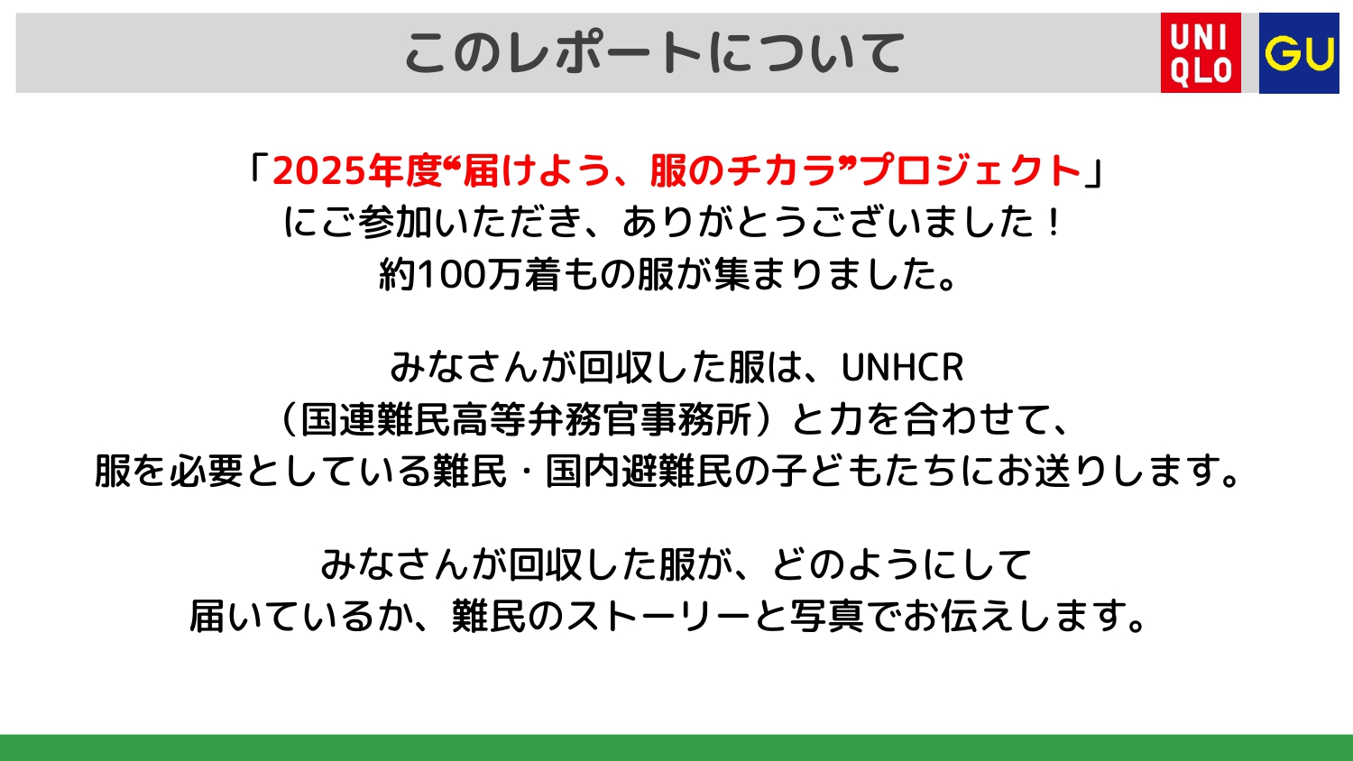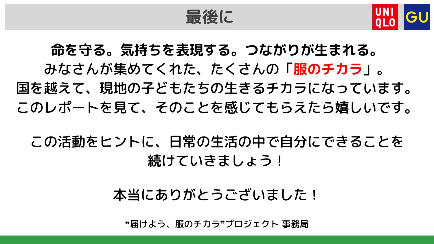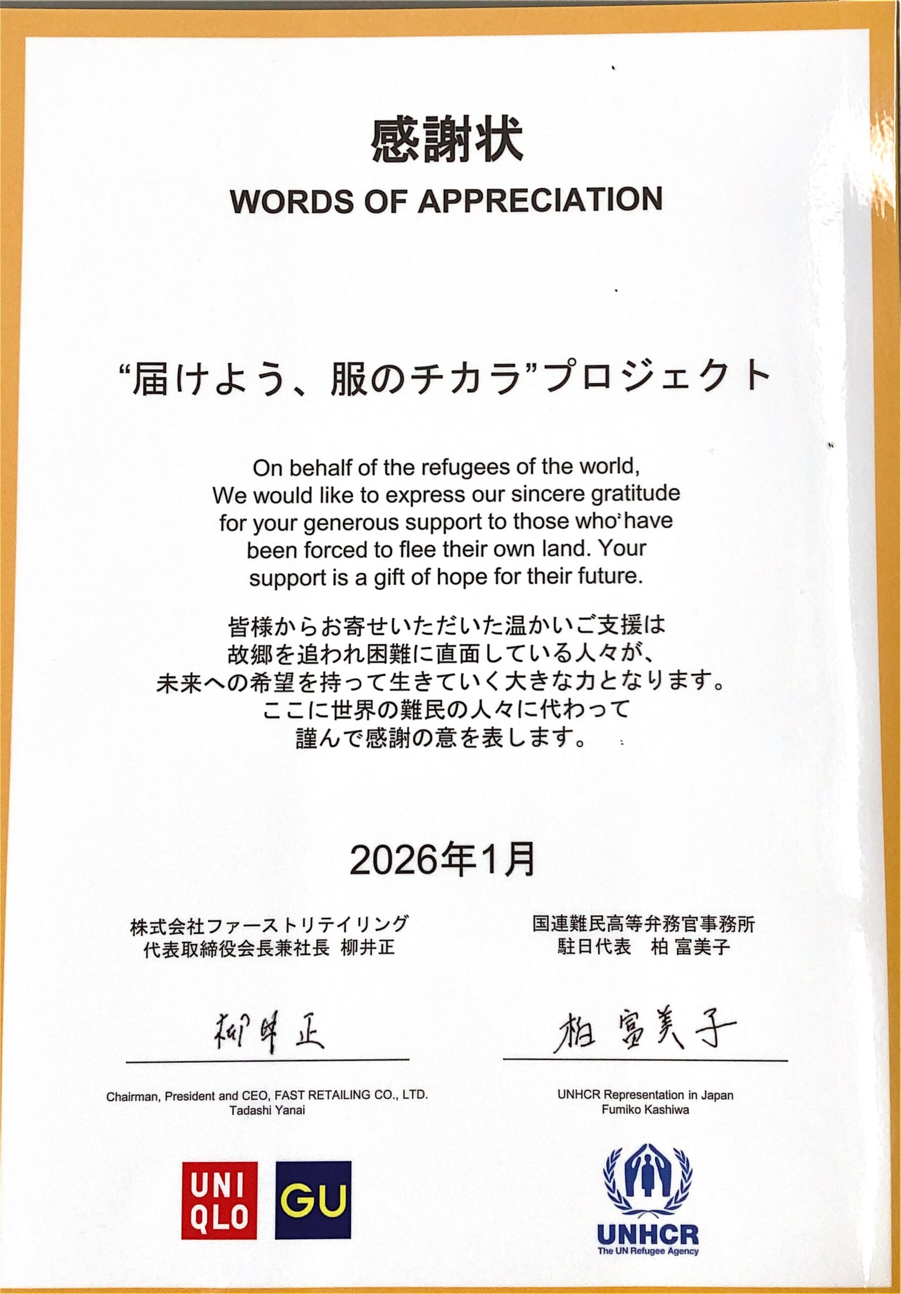 1/30 ユニクロ”届けよう、服のチカラ”プロジェクト よりフォトレポートと感謝状が届きました