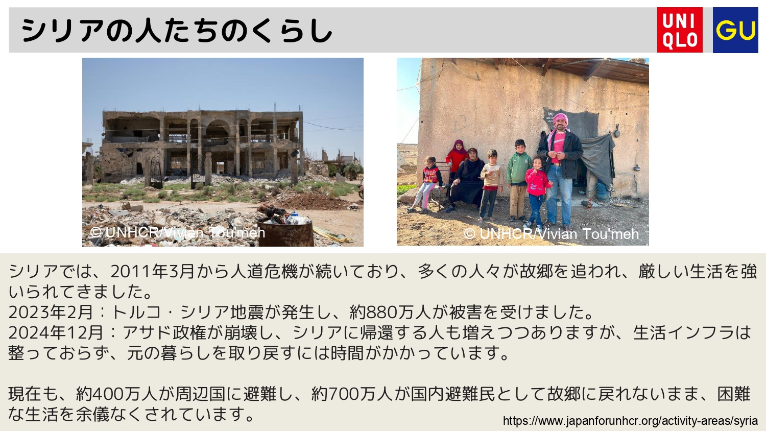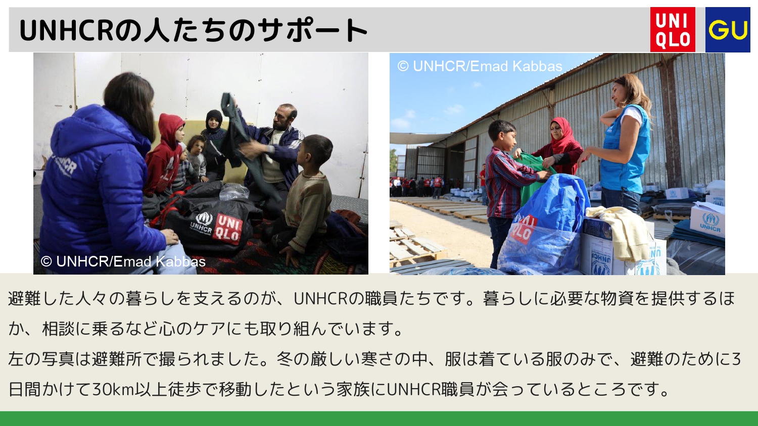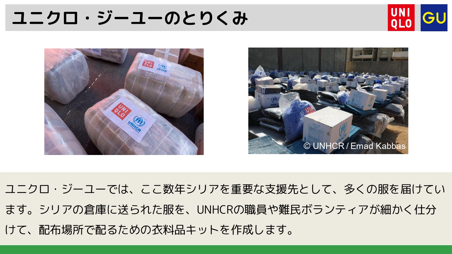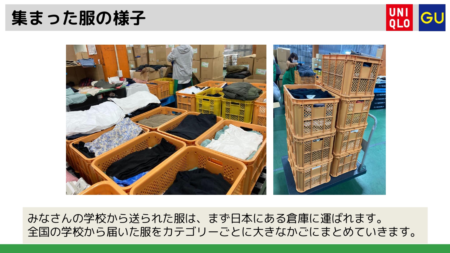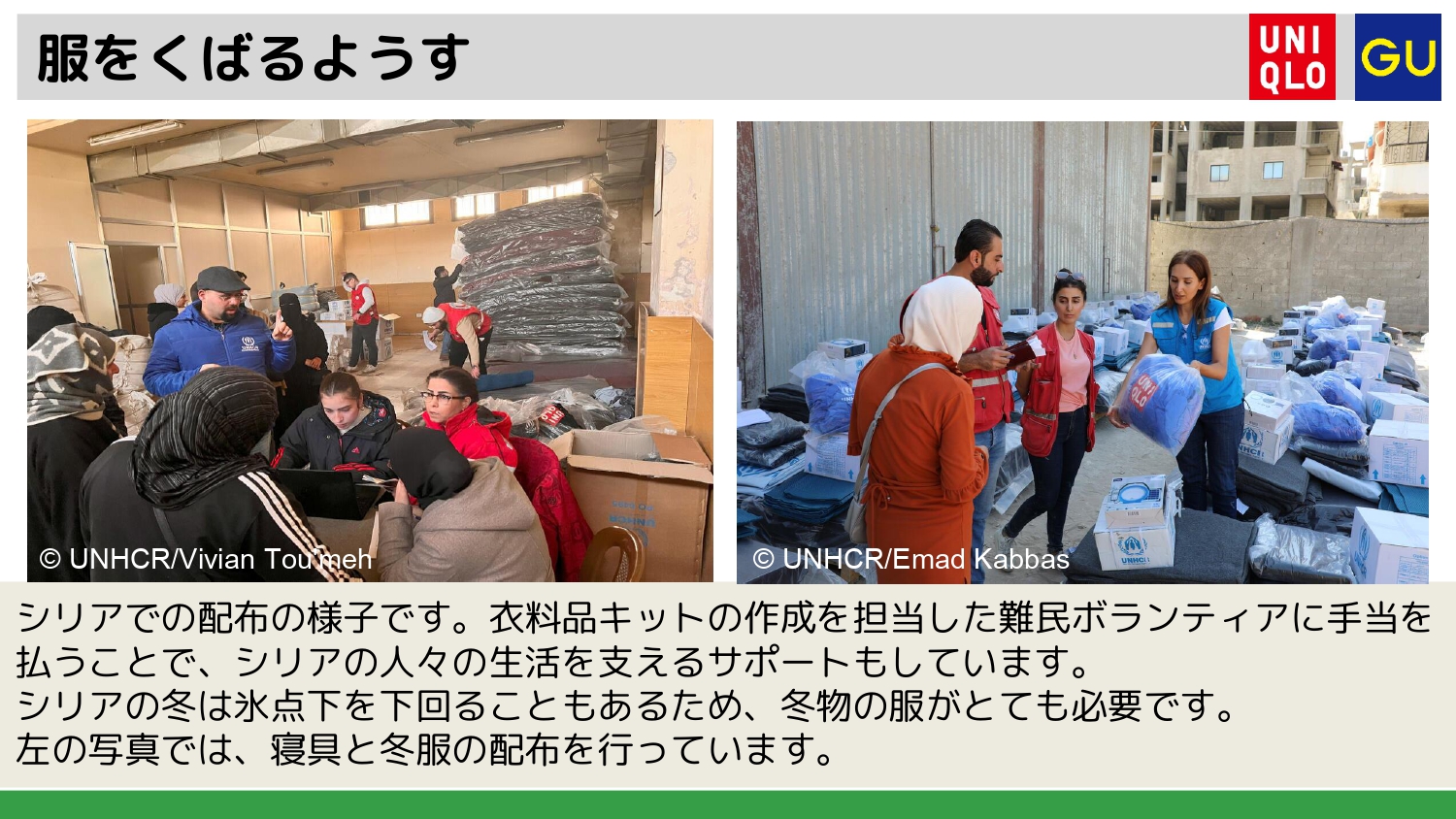 1学期から取り組み始めた、ユニクロ”届けよう、服のチカラ”プロジェクトの仕上げとして、今年も難民キャンプよりフォトレポートと感謝状がが届きました。今年はシリアとアラブ共和国に私たちが集めた古着が届けられたということでした。次年度以降も継続して、支援を続けられるように活動したいと思います。